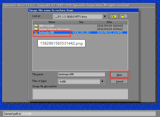 10、接着根据我们之前存放的备份系统路径,找到备份的系统,点击“open”按钮。