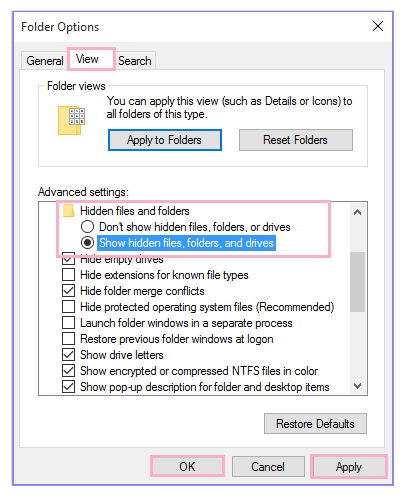 3、 选择内容“显示隐藏文件、文件夹和驱动程序”,接着点击“应用”和“确定”。