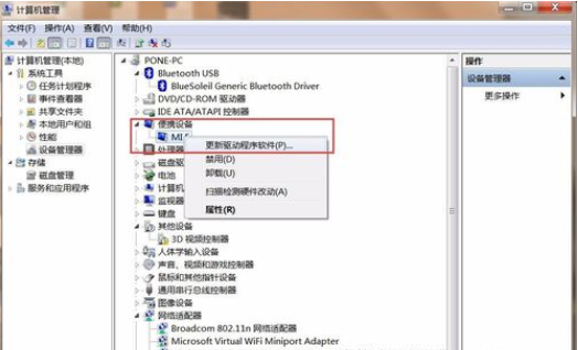 5,如果你想要更新小米手机驱动程序的话,在设备管理器中,对着设备列表中的“便携设备”击右键,选择“更新驱动程序”菜单。