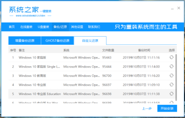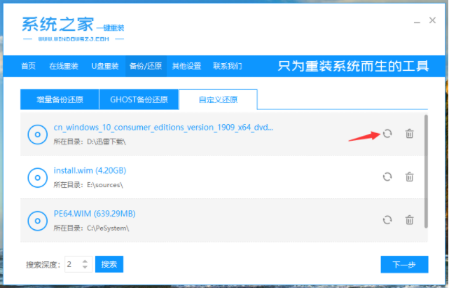 3、接着选择【自定义还原】,系统之家将搜索电脑内的系统镜像文件,点击搜索到的win10镜像文件的还原按钮。